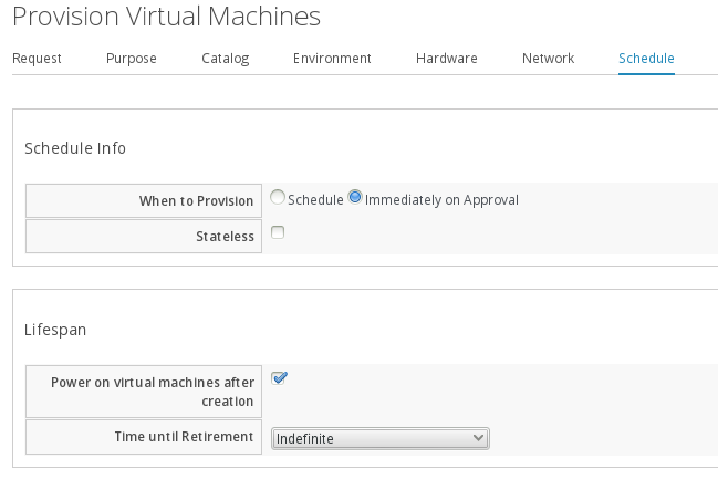 Click the Schedule tab to set when to provision your request and the lifespan of the virtual machine or instance.